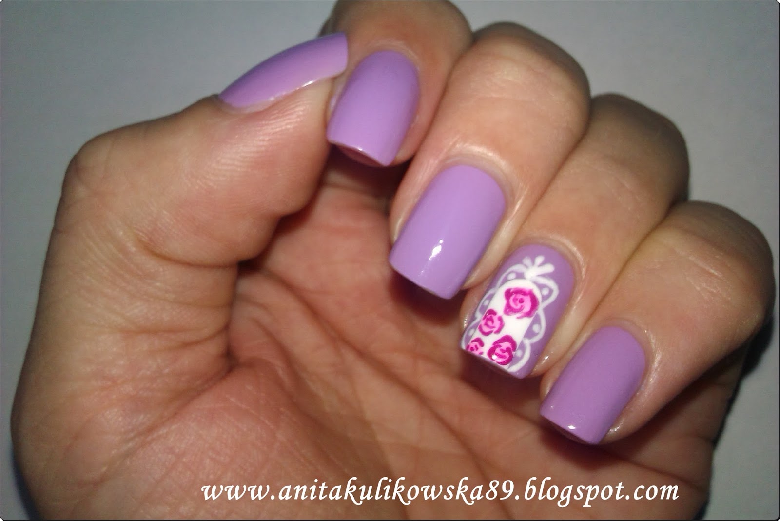 Kolejno białym lakierem Miss X #02 zrobiłam łuki koronkowe i mini kropki, sondą zaś wykonałam różowe plamki lakierem Allepaznokcie One Colour #33. Z tych plamek wykonałam różyczki pędzelkiem z użyciem lakieru Wibo Gel Like Amethyst Flirt (blogerska kolekcja). Całość pokryłam bezbarwnym lakierem Dor nr 0.